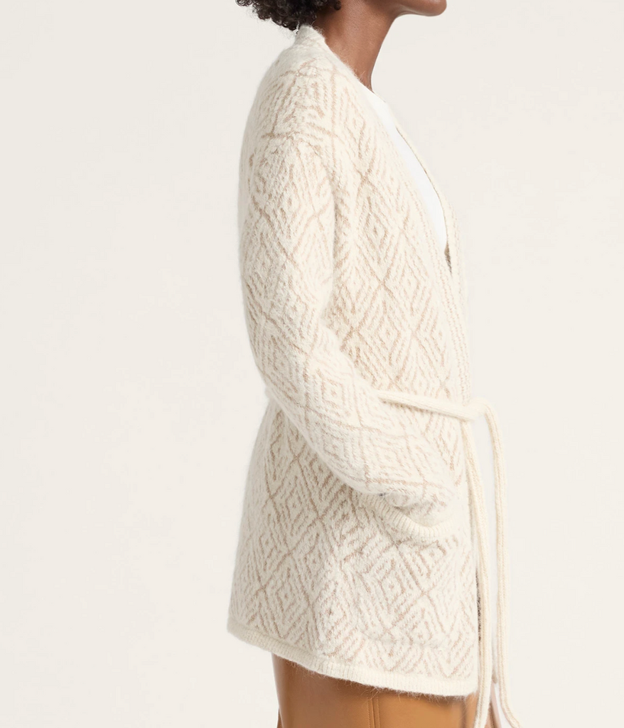 Luxuriously soft with subtle dimension, this open-front cardigan is knit from alpaca boucle blended with merino and cotton for a refined texture. A relaxed fit with dropped shoulders, self-belt, front pockets and soft drape makes it an elegant layer for work or weekends. Designed for comfort, longevity, and understated style.