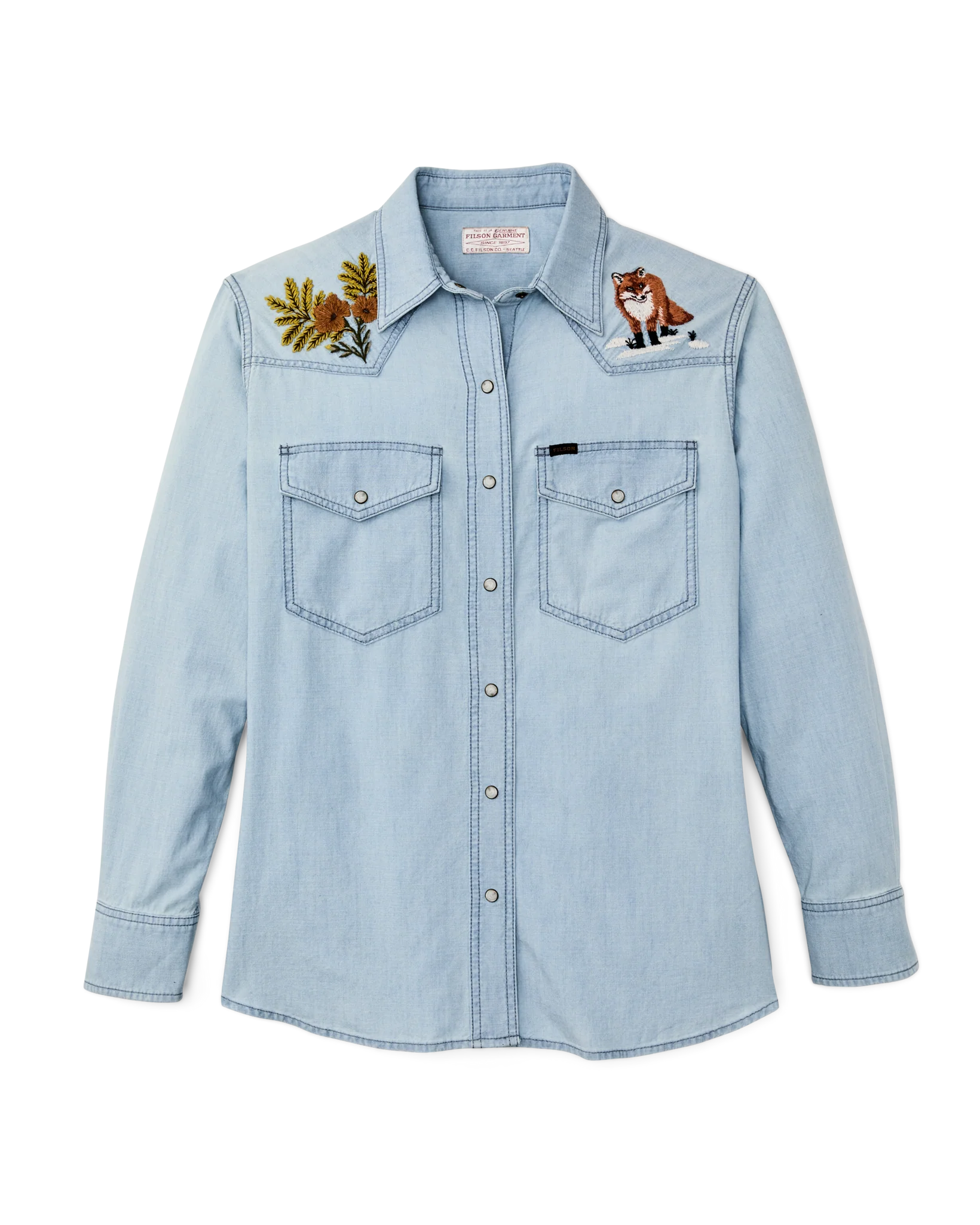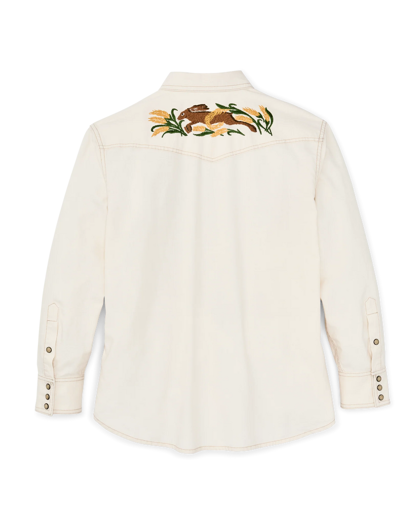 A Western-style shirt made with cotton chambray, a lightweight and durable fabric rooted in classic workwear. True to tradition, the pockets and yoke are pointed and the front and cuffs secure with snaps. Wildlife embroidery on the front yoke and back add a bit of flair. Spread collar and shirttail hem.