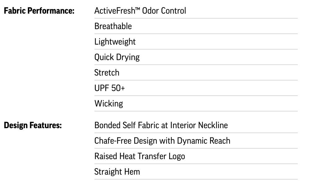 Engineered with lightweight, breathable fabric, this technical tee offers UPF 50+ sun protection and ActiveFresh™ odor control to keep you cool through extended activity. The quick-drying, moisture-wicking construction manages sweat, while the chafe-free design and dynamic reach patterning move naturally with you. A bonded neckline and straight hem enhance comfort, and a raised heat transfer logo finishes the look with subtle branding.