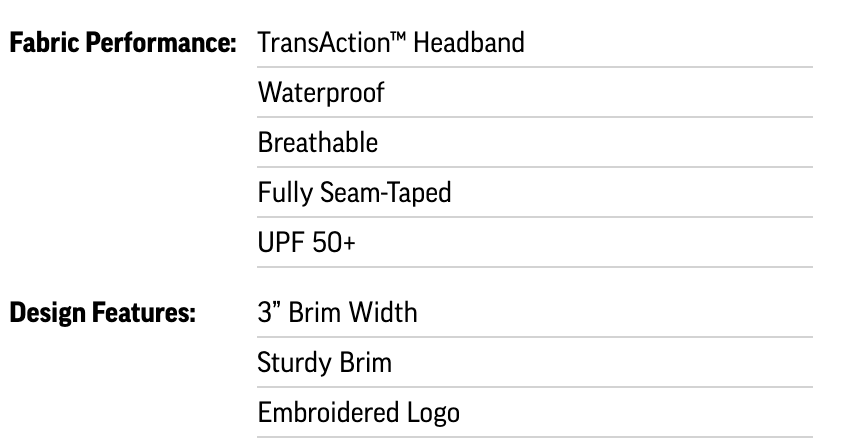 The Seattle Rain Cap is fully seam-taped for complete waterproofing, with a 3" brim to block rain and sun. The GORE-TEX construction delivers waterproof durability, and the TransAction™ headband provides ventilation and wicks away moisture. The UPF 50+ rating protects from the sun's UV rays, and an embroidered logo adds subtle OR branding.