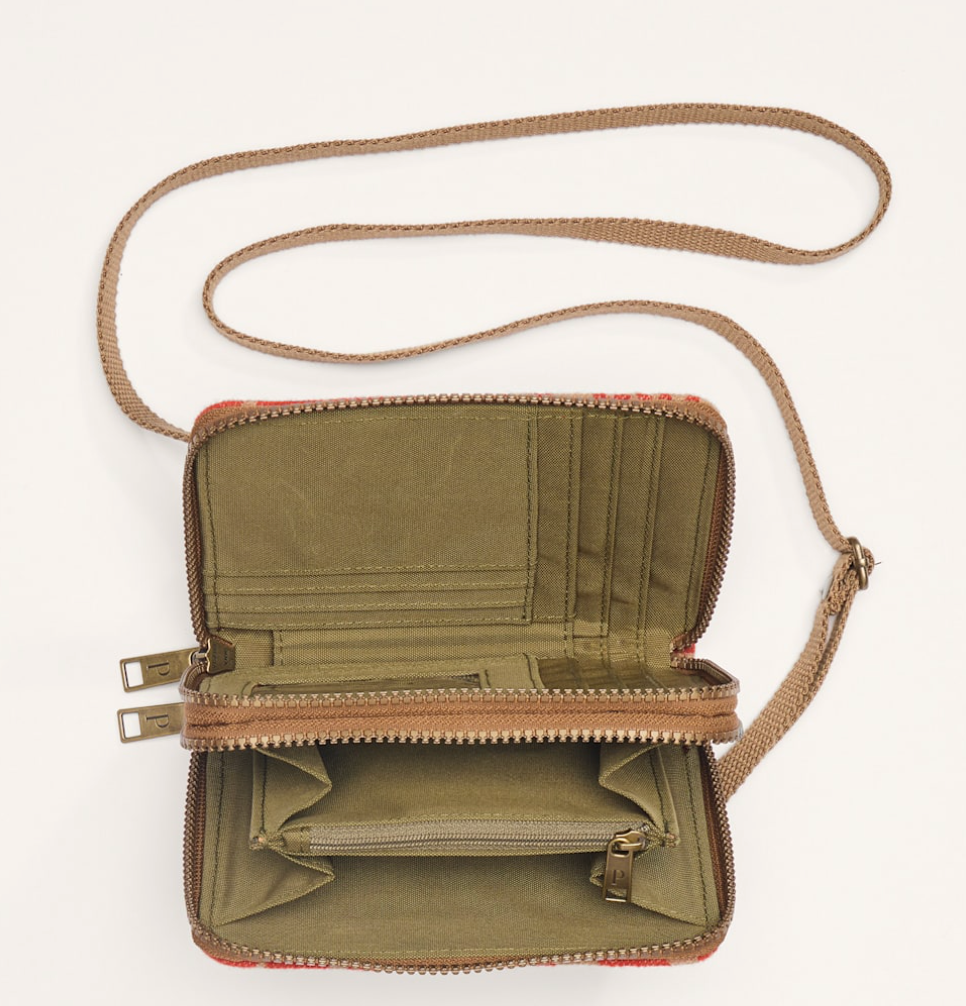 Part wallet, part small purse, this travel-friendly organizer is the perfect size for your essentials. Zipper closure runs along three sides of the organizer, making it easy to access the card pockets. 53½“ removable crossbody strap. Features our historic Harding pattern, woven in the USA from 100% virgin wool; pattern placement may vary.