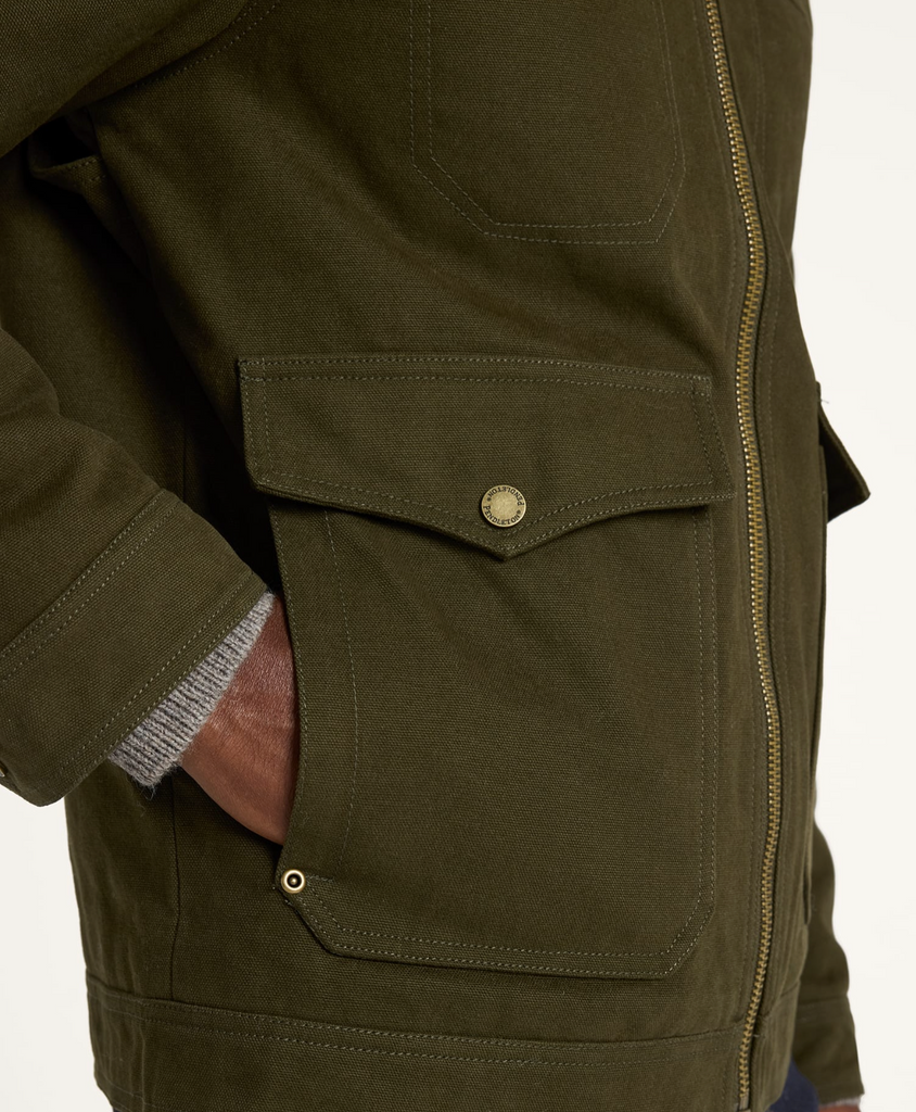- Shell: 100% cotton canvas; trim: polyester/nylon; Upper lining: 60% wool/40% polyester; lower lining: 100% cotton; sleeve lining: polyester.