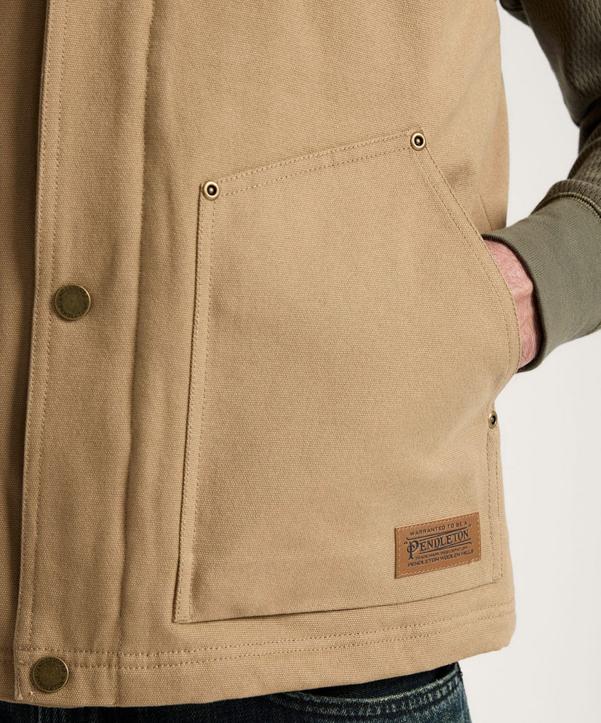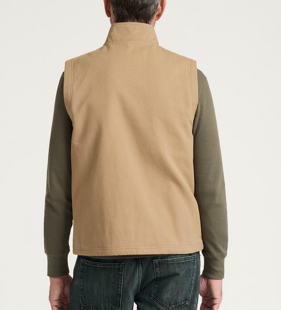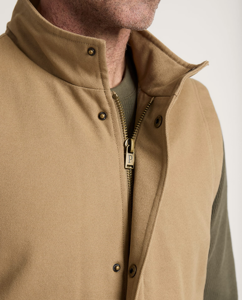 A workwear-inspired men?s vest made from durable 10-oz. Big Sky Canvas, this rugged vest is lined with wool-blend Mt. Hood flannel along the upper back and cotton muslin along the lower body. Features a zip front with a snap storm placket, two angled lower patch pockets with rivet detail, and secure inner pockets for valuables.