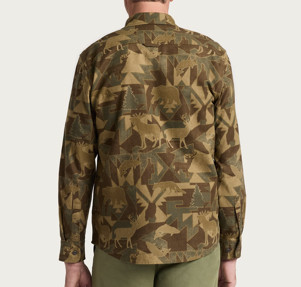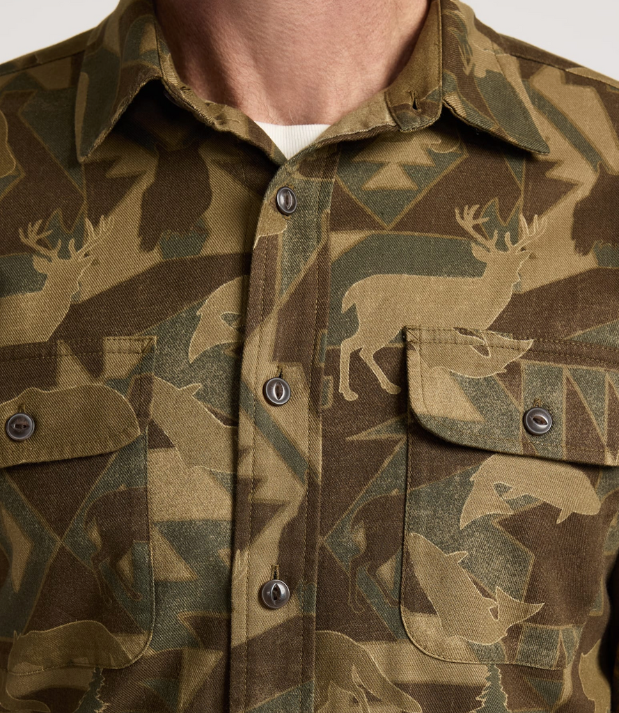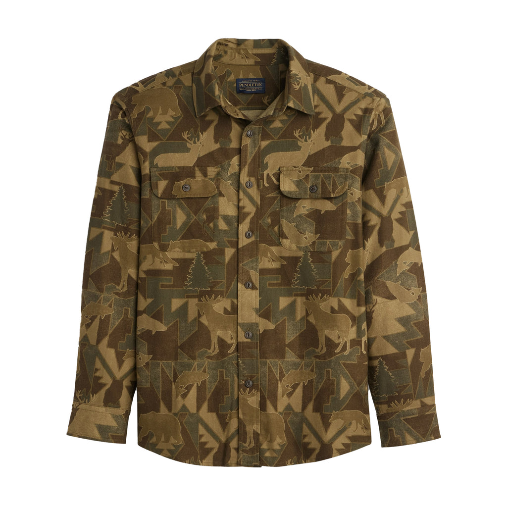 Classic Pendleton geometric motifs meet traditional camo in this durable cotton twill shirt. Features a spread collar, button closures, two flap button-through chests pockets, and a shirttail hem.