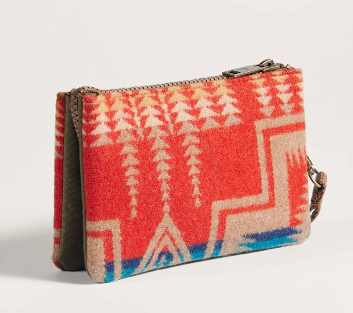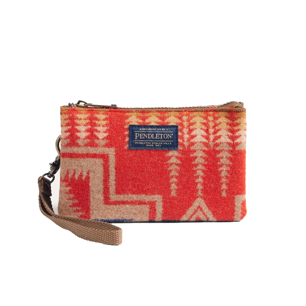 Three lined pockets keep essentials organized and easily accessible when you're on the go. Top zipper and removable wrist strap. Pattern placement may vary.