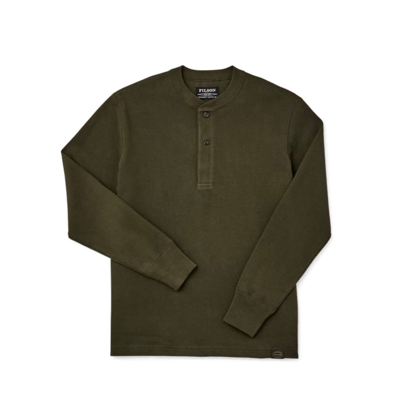 Filson's new Waffle-Knit Henley combines all of the thermal retention and breathability of Filson's proven thermal crewneck with a two-button Henley collar for versatile temperature regulation. The waffle-knit interior ribbing creates a layer of air between the body and fabric for thermal retention and moisture management. Worn solo or under a jacket, this dependable classic style provides versatile comfort in a wide range of temperatures. Heavy-duty ribbed cuffs and collar retain their structure for lasting durability. The long-staple Peruvian cotton is soft and sturdy.